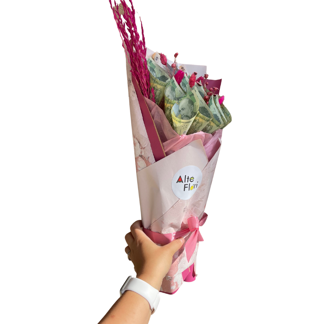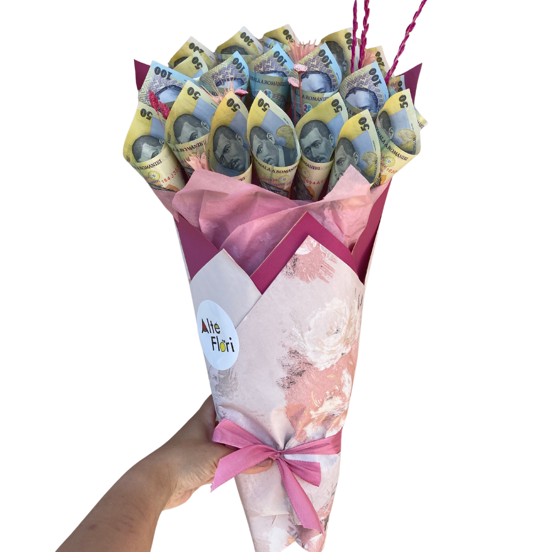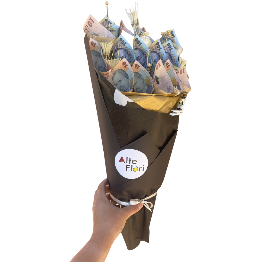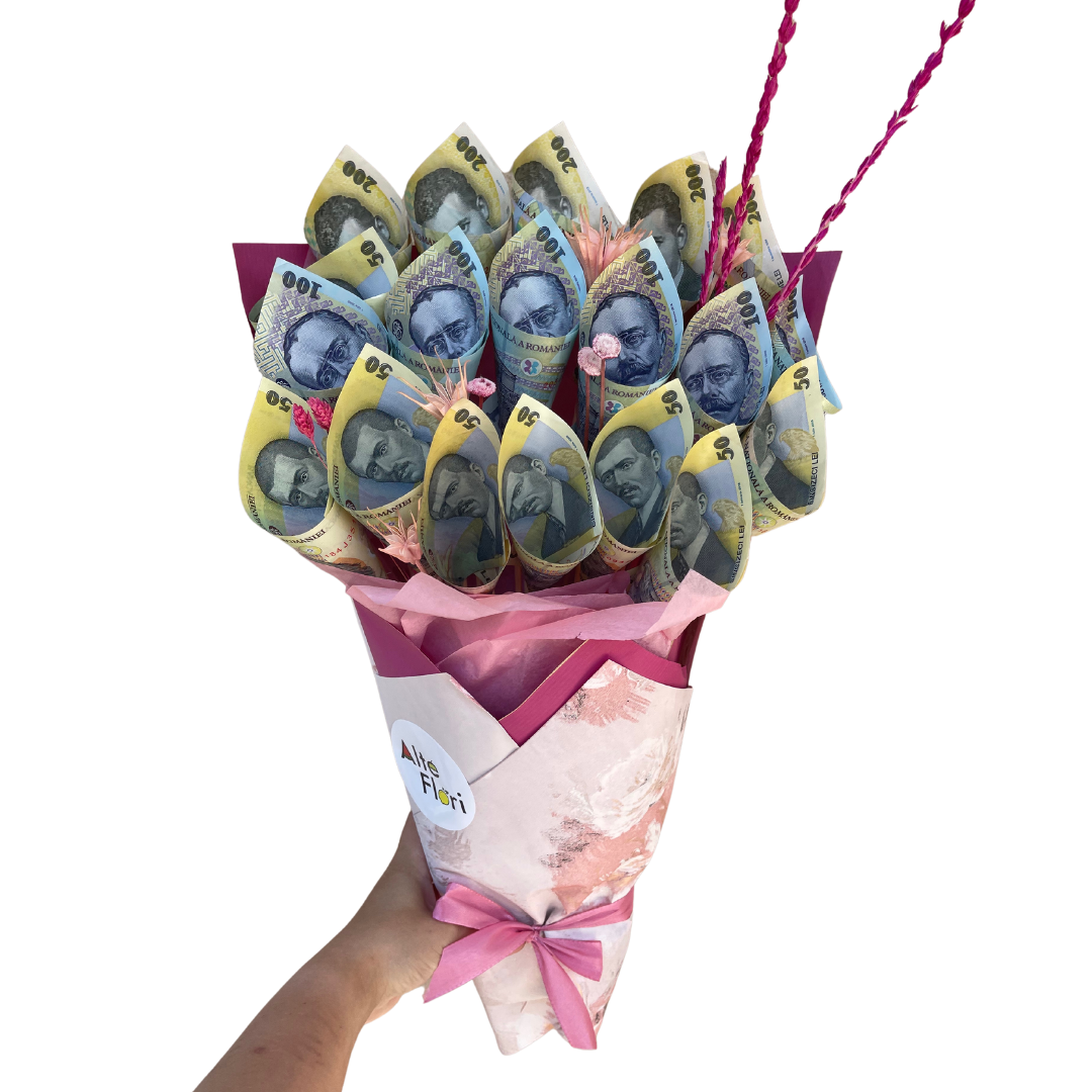Manopera este inclusa in pretul buchetului. Calculul este urmatorul: un buchet care costa 350 de lei, o sa aiba bancnote in valoare de 200 de lei (150 fiind manopera).