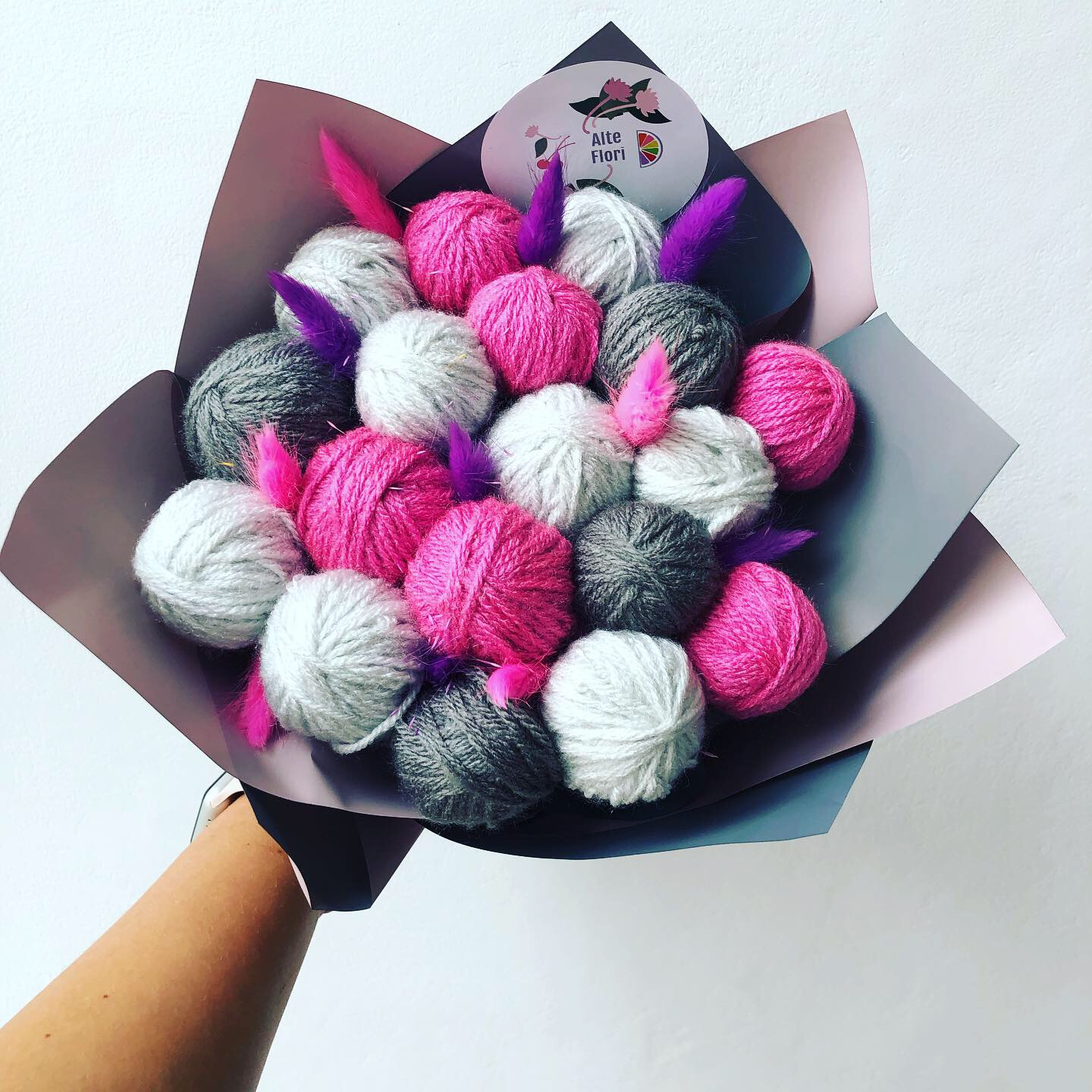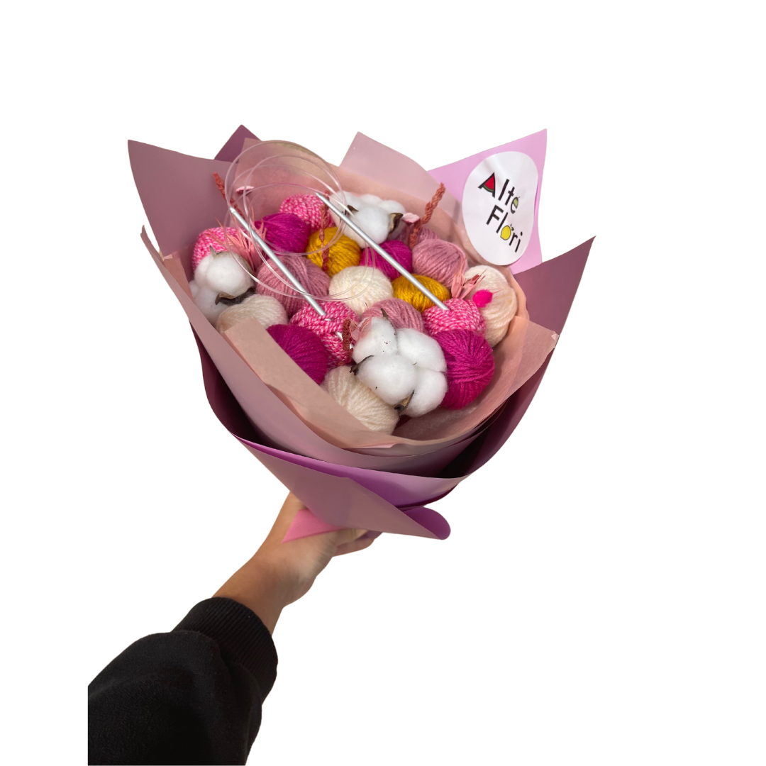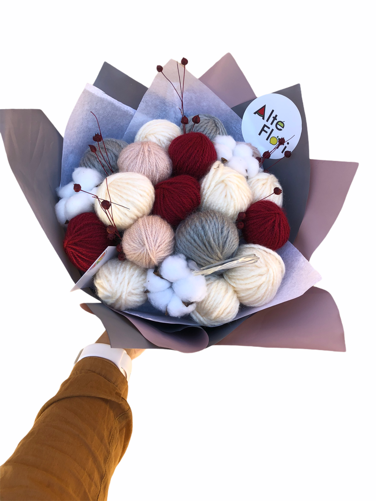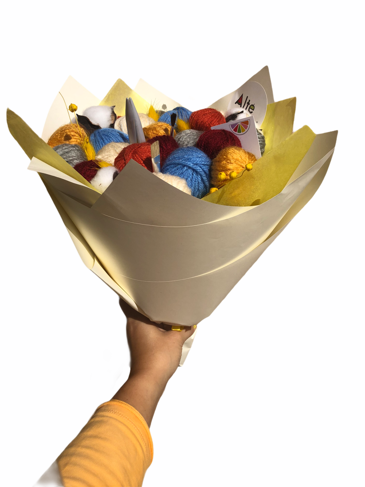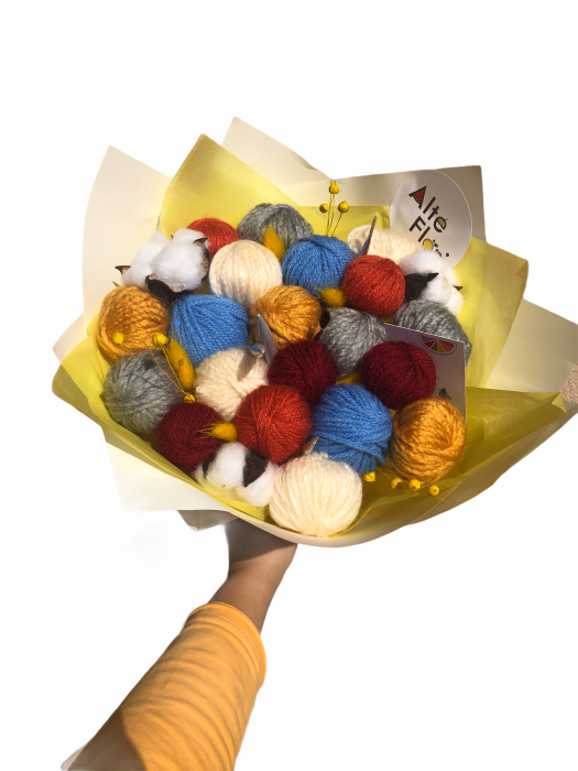 Buchet format din gheme de ata de diferite culori (in functie de stocul disponibil - va rugam sa mentionati daca doriti anumite culori) si ace de crosetat. Optional se pot adauga si alte elemente in buchet.