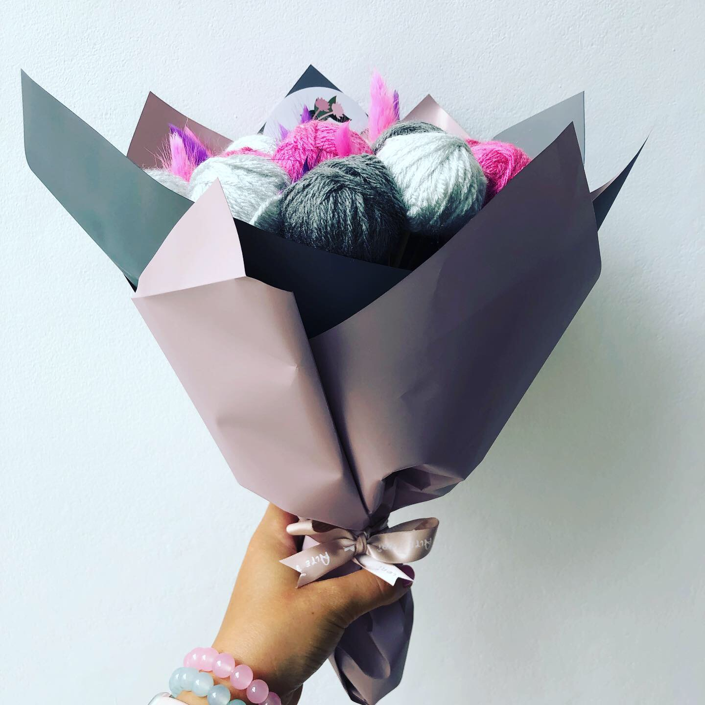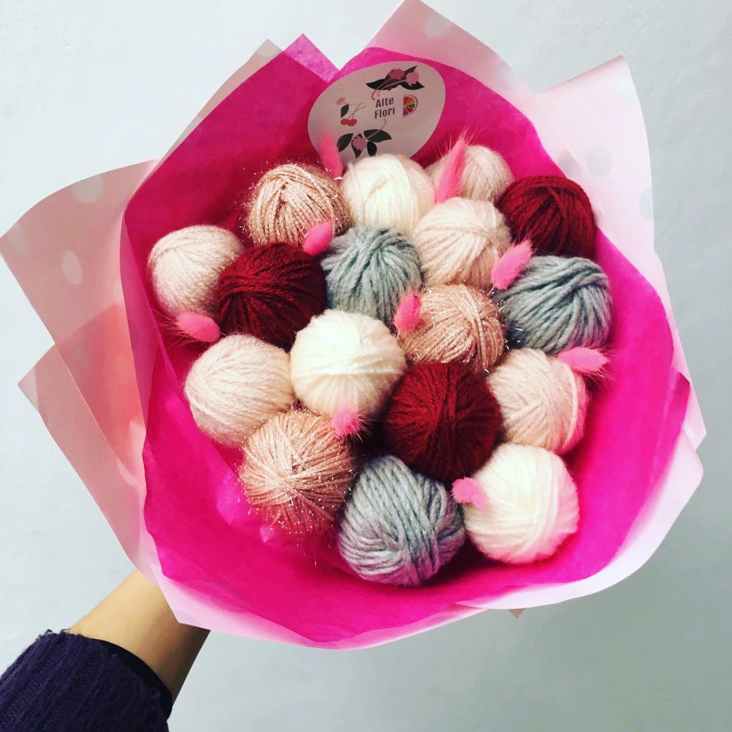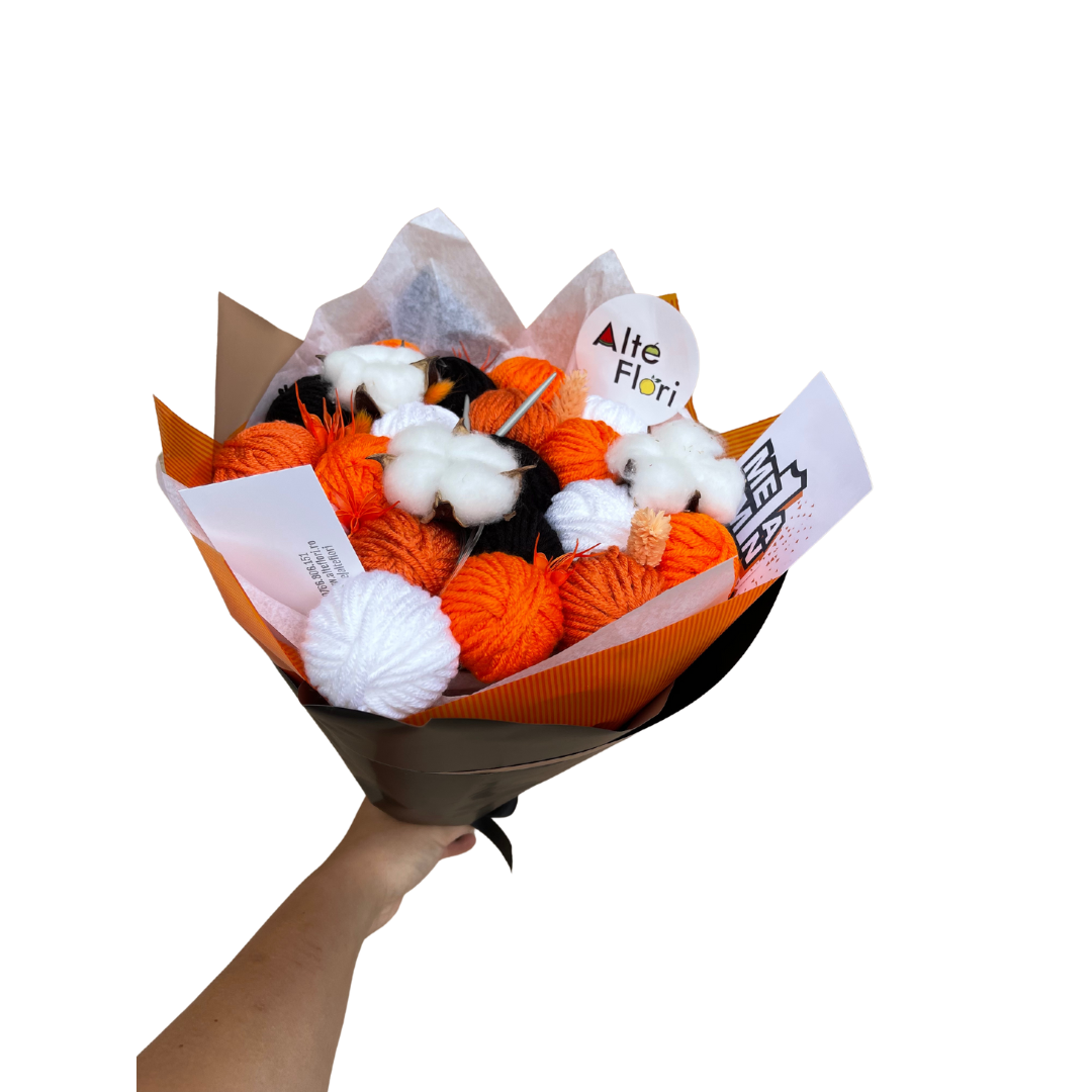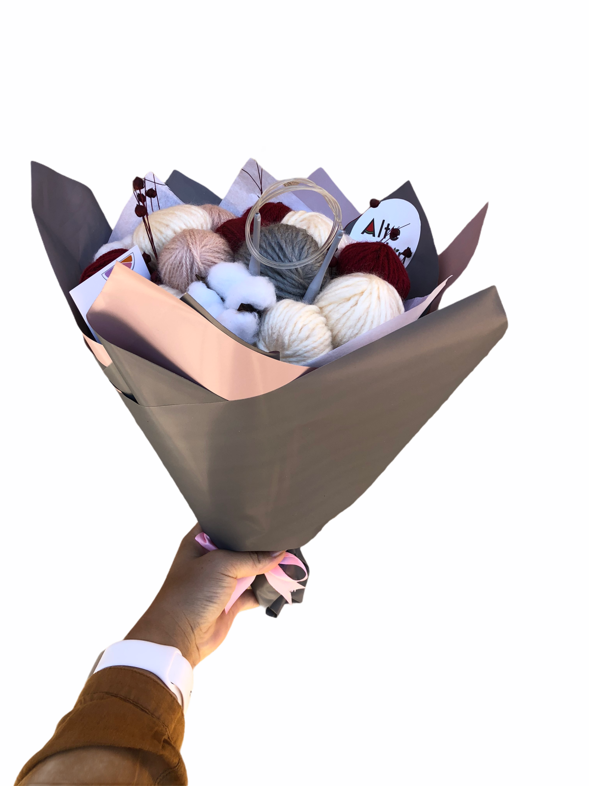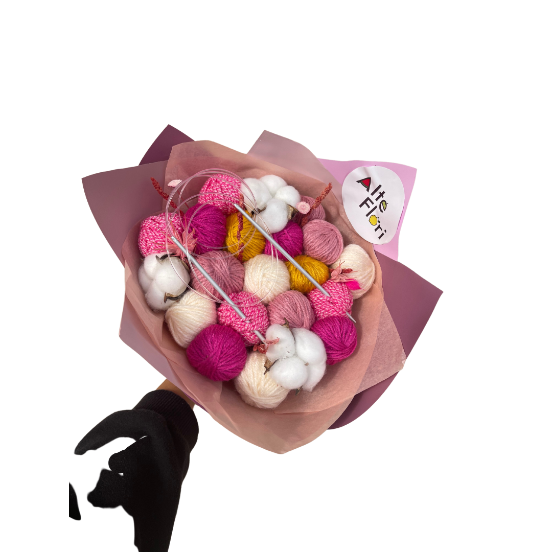 Buchet format din gheme de ata de diferite culori (in functie de stocul disponibil - va rugam sa mentionati daca doriti anumite culori) si ace de crosetat. Optional se pot adauga si alte elemente in buchet.