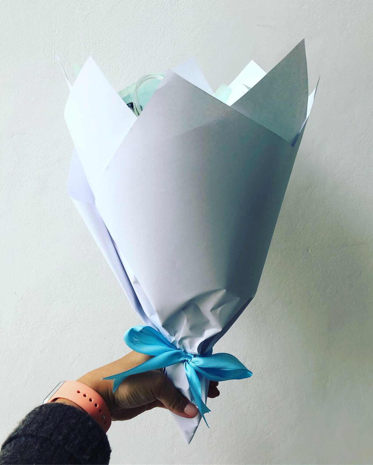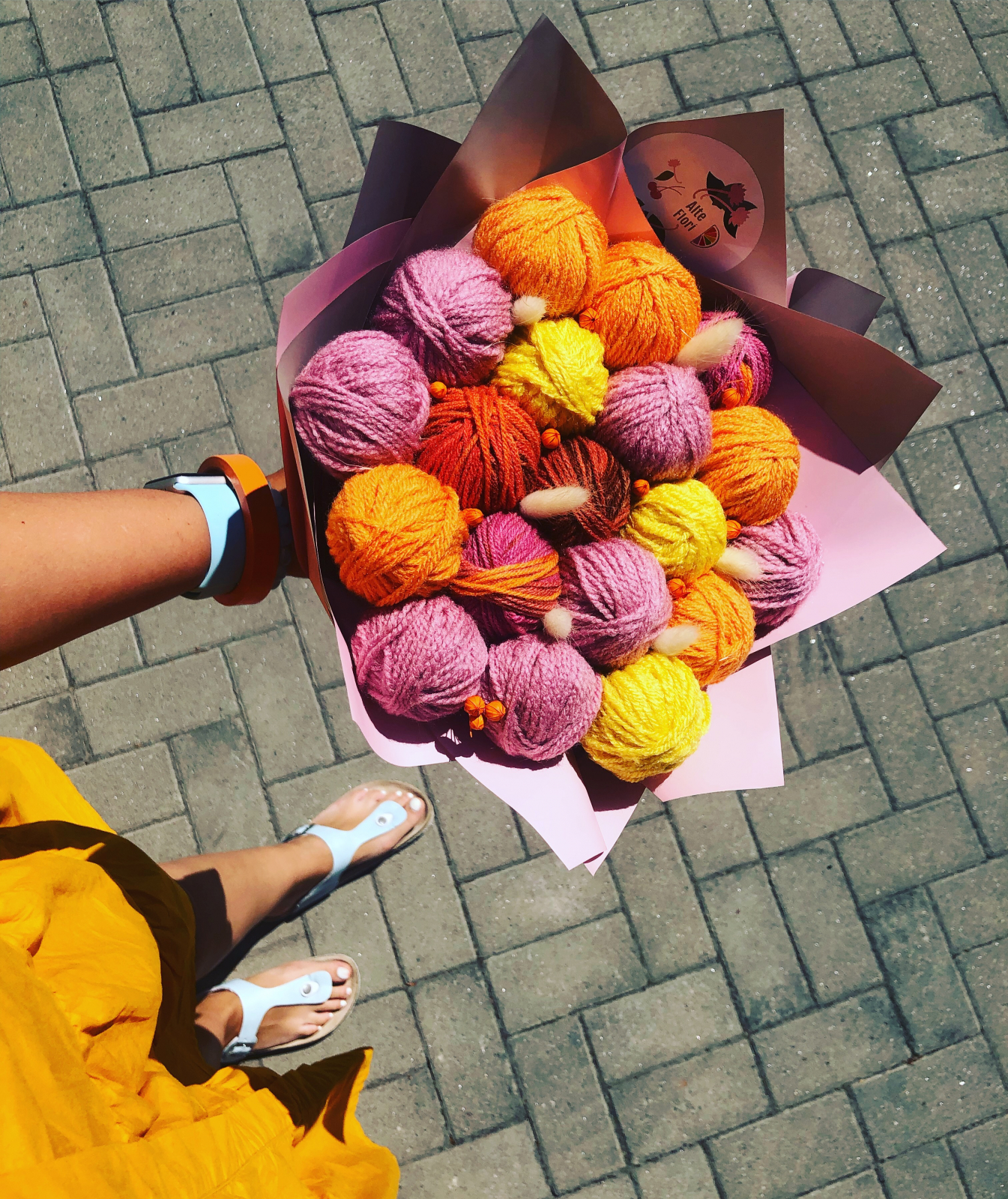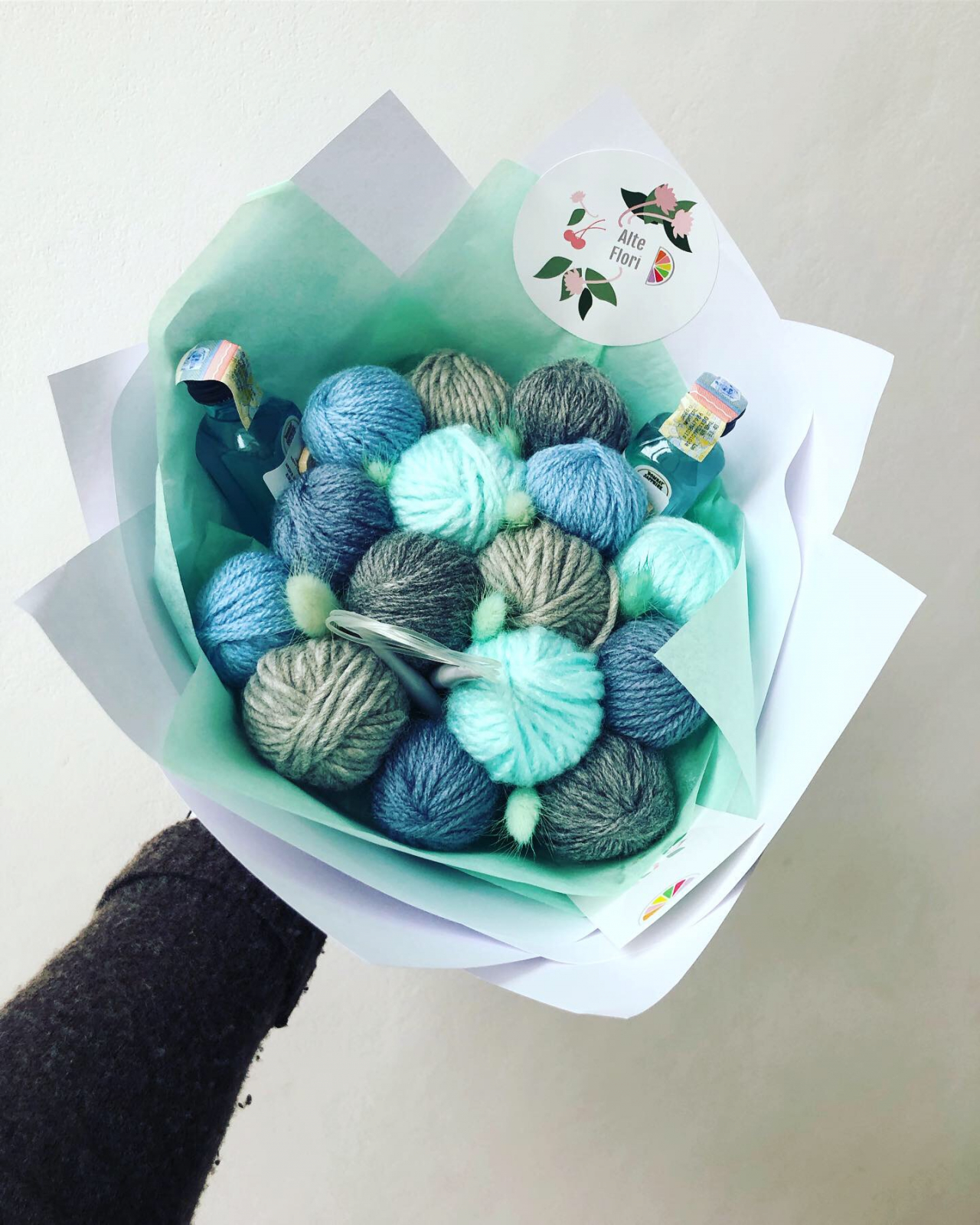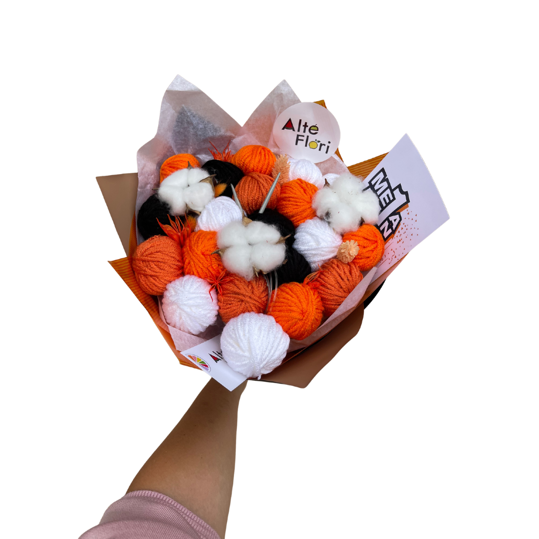Buchet format din gheme de ata de diferite culori (in functie de stocul disponibil - va rugam sa mentionati daca doriti anumite culori) si ace de crosetat. Optional se pot adauga si alte elemente in buchet.