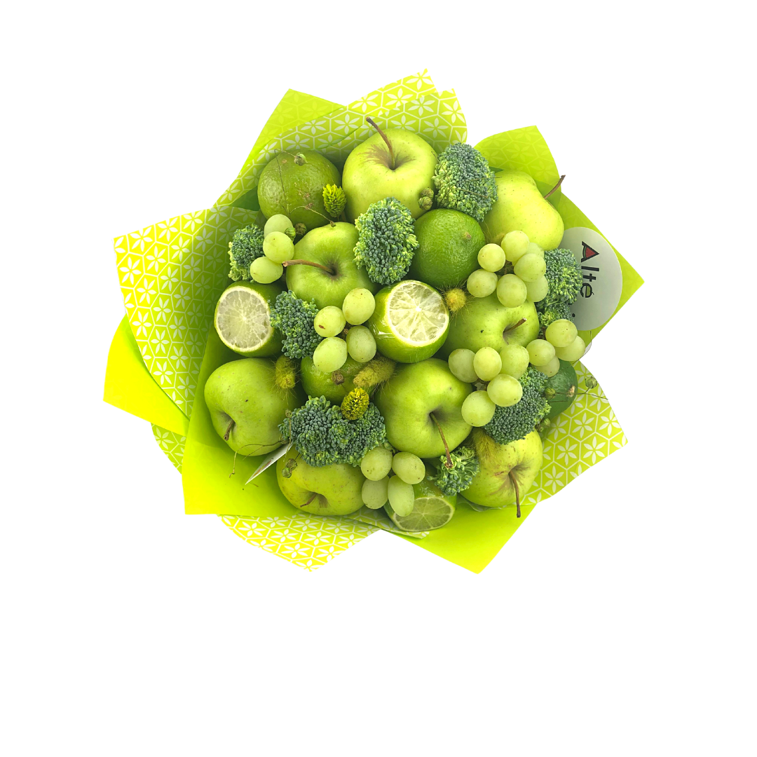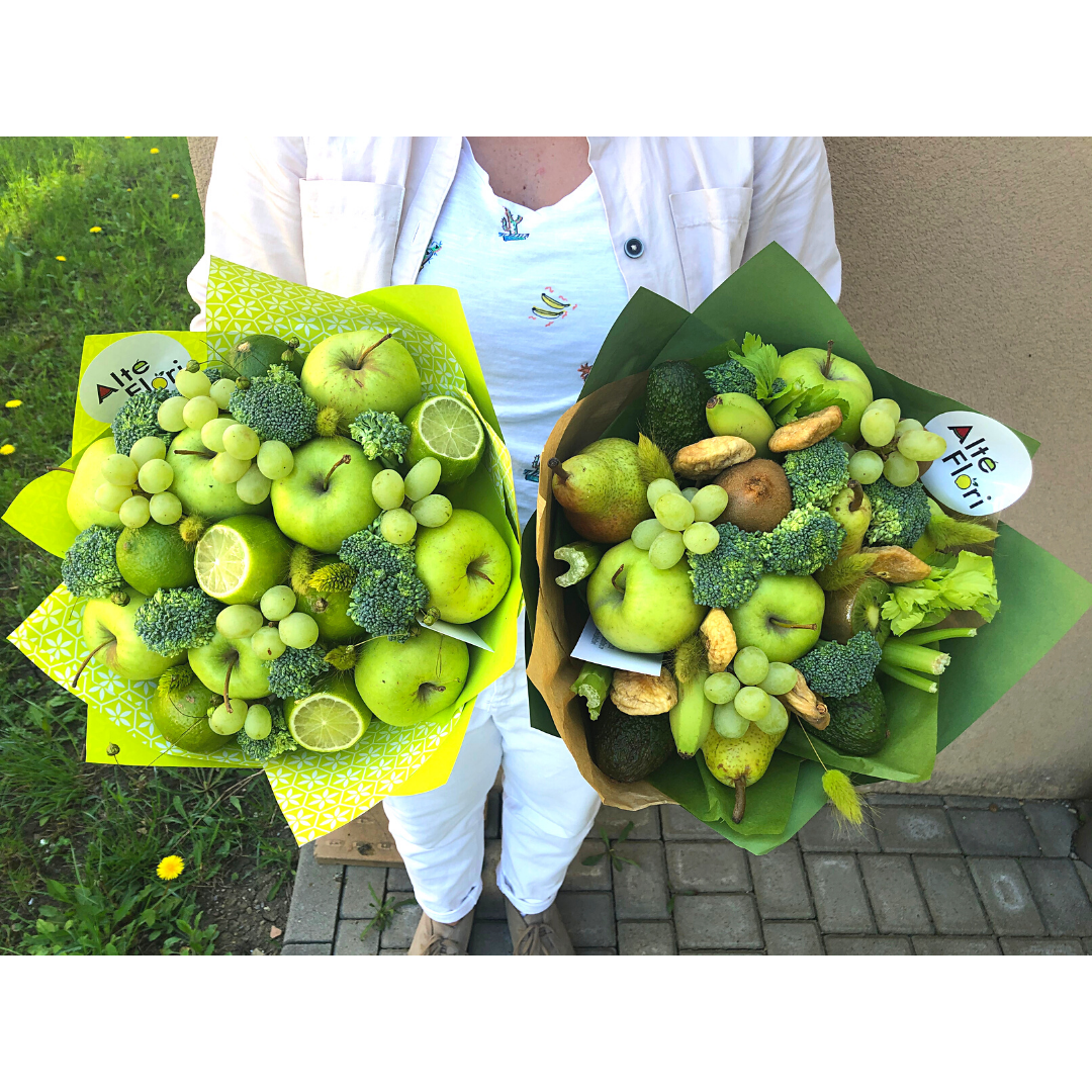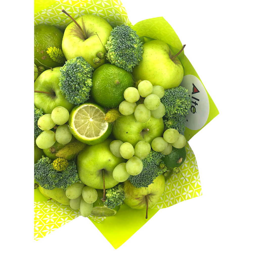 Buchet format din mere verzi, lime, brocoli, struguri verzi si flori sau detalii uscate.
