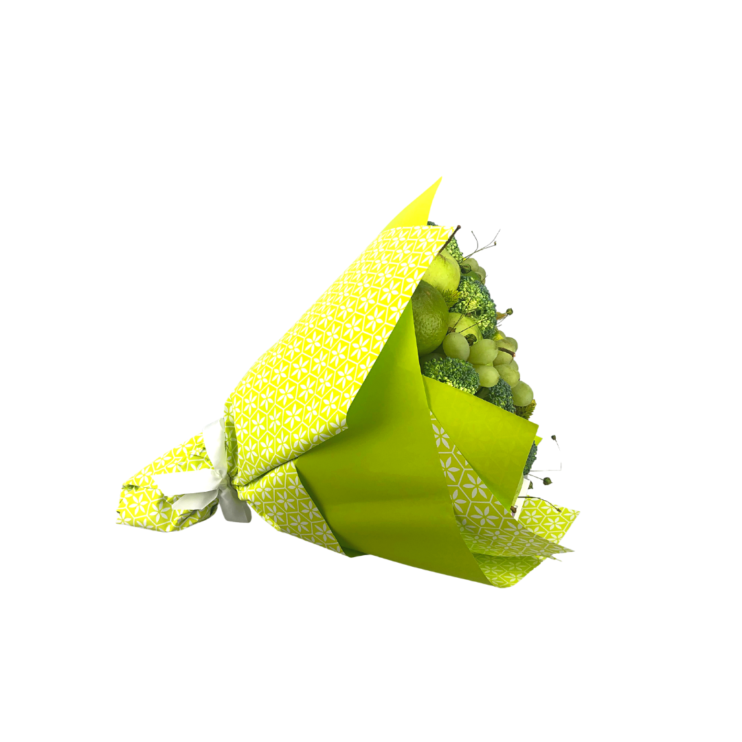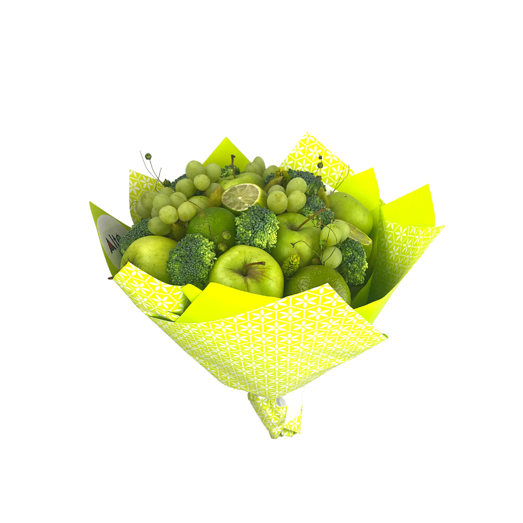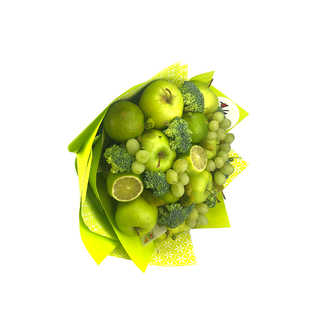Buchet format din mere verzi, lime, brocoli, struguri verzi si flori sau detalii uscate.